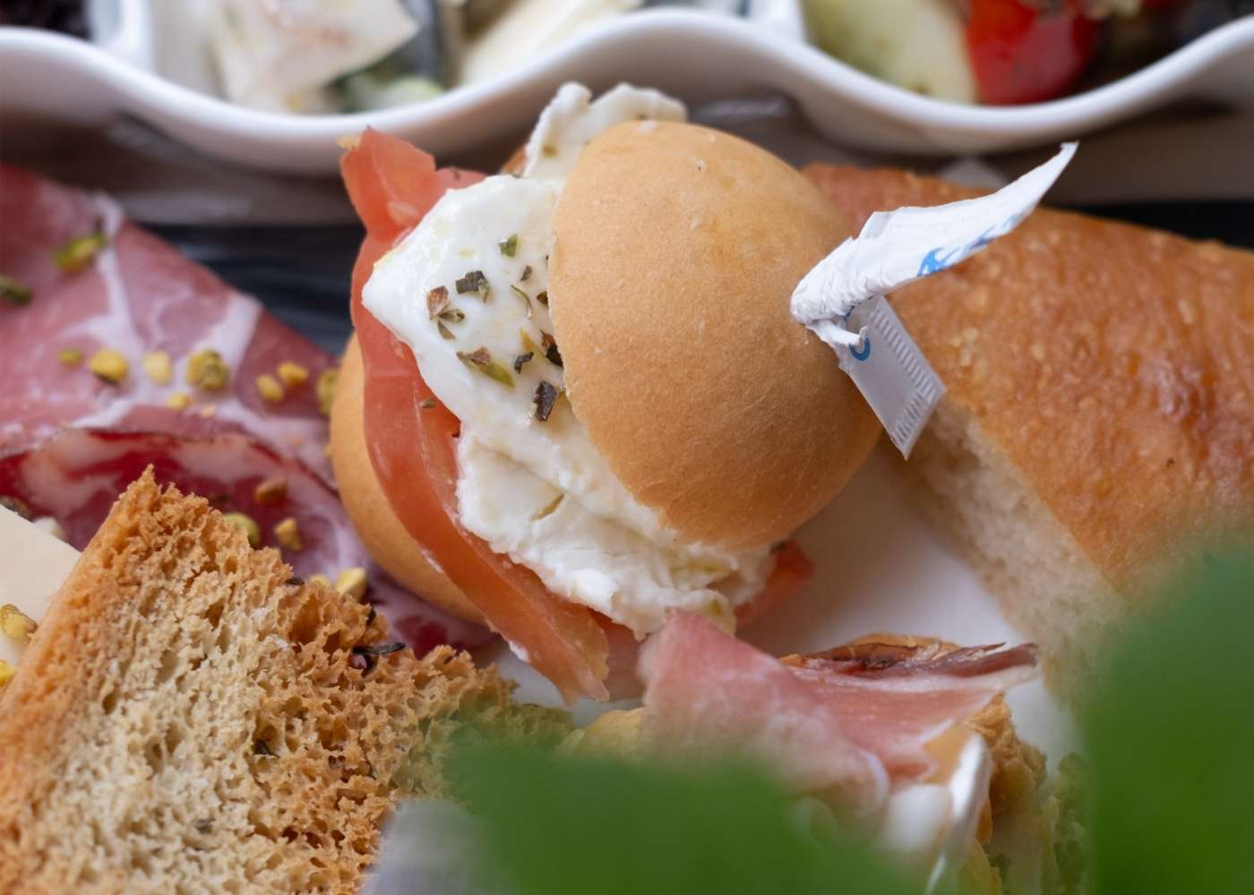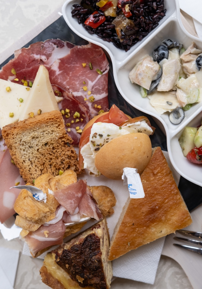 Il menù per eventi è studiato per deliziare ogni ospite, con piatti della tradizione come vitello tonnato e taglieri di salumi e formaggi, affiancati da finger food contemporanei, canapé decorati a mano, Pan Surprise farcito a strati, croissant salati e pasticceria mignon.